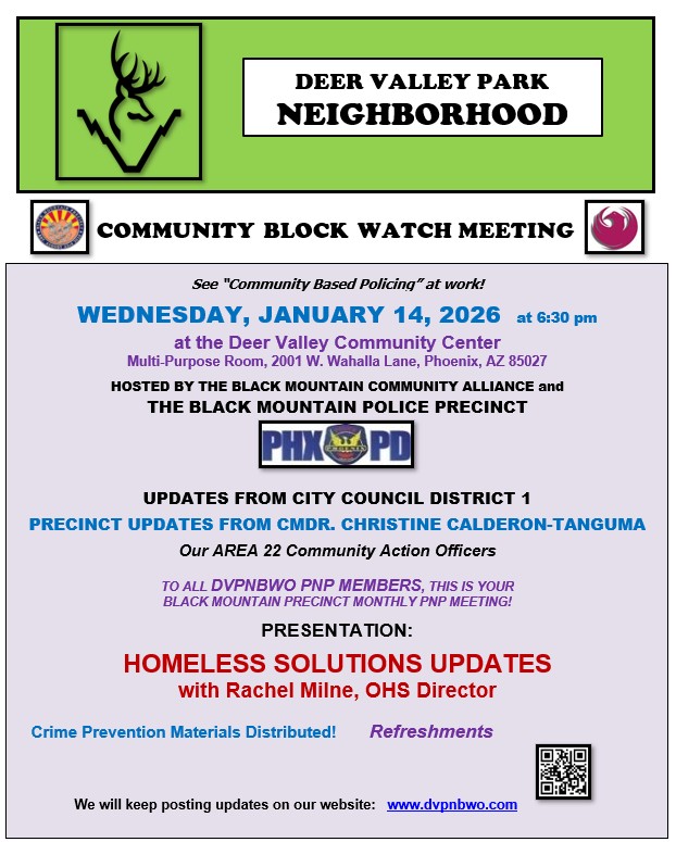 If you are interested in attending a Citywide Training Class for Block Watch and Phoenix Neighborhood Patrol, they are held throughout the year on certain Saturday mornings at the Mt. View Precinct Community Room, 2075 E. Maryland Avenue (btw. Glendale Ave. & Bethany Home Rd.) where seating is limited, please e-mail Detective Brian Kornegay at brian.kornegay@phoenix.gov for the dates and to R.S.V.P.